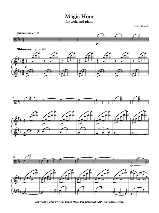 I originally wrote Magic Hour in 2001 as a short interlude in my piano trio Swing Shift, a work inspired by New York City at various hours in the nighttime. The “magic” or golden hour is the glorious fleeting moment at sunset on a clear day when the entire city is bathed in a warm, glorious glow. Over the years, the short (2 min.) work took on a life of its own and during a moment of pandemic-induced productivity, I arranged it for viola and piano so Monica and I could have something fun to do.